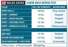 The fastest way to attach light hardware to a cored deck is a self-tapping screw. It is also the fastest way to have hardware rip out of the deck and end up with a wet core and delaminated deck. But how to replace screws that have gotten loose or prevent a wet deck in your future? One method is to drill and over-sized hole, remove some core, fill the enlarged hole with epoxy, and then replace them with small through bolts (see Spreading the Load Practical Sailor, August 2016). But what if the backside is inaccessible? Can we create an improved repair by filling and reinstalling a self-tapping fastener, without major surgery? What sealing and filling material is best?