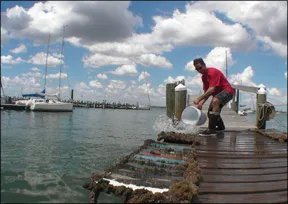 Prior to rating the paints, testers sluice the panels with a bucket of salt water. Paints were rated Excellent (no growth), Good (light soft growth), Fair (moderate to heavy soft growth), and Poor (hard growth). Any paint rated Fair or better is continuing to meet its designed purpose.