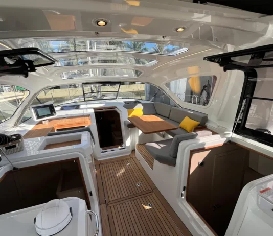 At last winter’s Paris Boat Show, Beneteau Groupe debuted a four-boat line intended to capitalize on its “design advantage.” Light and space were emphasized. “Ease of handling” and “intimacy with the elements” were buzzwords. The Beneteau 46 is a performance cruiser—long, low, and streamlined. Although it may look too racy to be a cruising boat, it is unique, attractive, and easy to handle. Its lowered center of gravity and elevated freeboard give it more initial stability than previous designs, and its mega-beam and firm bilges give it the power to carry sail well up the wind range. The 46 couples the naval architecture of Jean Berret and Olivier Racoupeau with an interior designed by Massimo Gino and Mario Pedol of Milan’s Nauto Yachts. Pros on deck include wide sidedecks, twin wheels that provide good visibility from the helm, adequate ventilation for warm climates, and a divided anchor locker. At sea with 10 knots of breeze, testers found that the Beneteau 46 helm remained light and the boat tacked through 90 degrees with minimal fuss. They noted a balanced helm and easy steering under both sail and power.