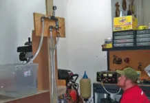 Our testing apparatus included a pressure gauge and shut-off valve rigged on an upright board that provided about a 6-foot lift—about the max for boats 40 feet or shorter. The rig has a 3/4-inch outlet with 3/4-inch hose leading down to a calibrated container; this permitted precisely timed runs to determine the actual gallons-per-minute flow. Pumps that offered multiple hose-diameter options were tested using the largest option.