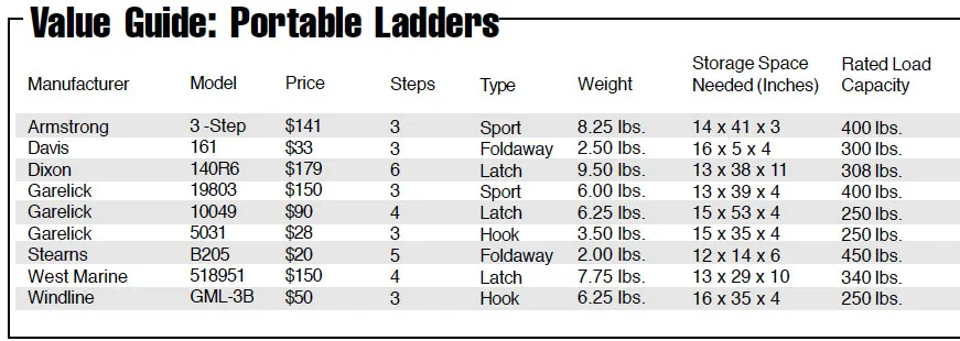 Garelick supplied three ladders for our evaluation, a 19803 3-step aluminum sport ladder, a 10049 4-step latch ladder, and a 5031 3-step hook ladder. Armstrong provided its 3-step stainless steel sport ladder, while both Dixon and West Marine sent along some welded stainless steel latch ladders: a 6-step 140R6 and a 4-step 518951, respectively. Windline was represented with its GML-3B 3-step hook ladder. Two companies supplied plastic foldaway ladders—Davis’ 3-step and Stearns’ 5-step.