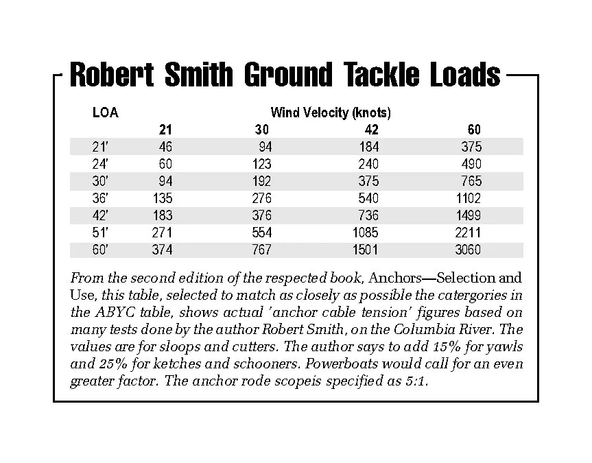 In sharp contrast to the ABYC data is the data published in the table of the third edition of Robert Smith’s 1983 book called Anchors—Selection and Use (see table at end of article).