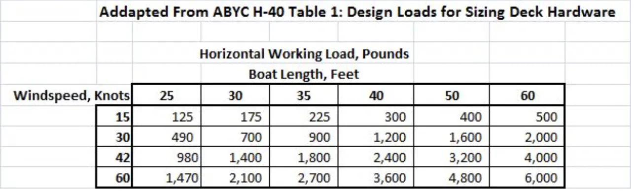 Philippe Ras, the ABYC technical director until 2003, said the much-used Table 1 in H-40 of the “Anchoring, Mooring, and Lifting Section” of the ABYC’s voluminous standards now is entitled “Design Loads for Sizing Deck Hardware.”