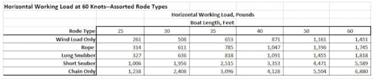 Getting to that single figure isn’t easy. But without it, how can one select an anchor? Or a rode, or whether it should be nylon line or chain? And it’s even more difficult to reconcile this quandary with the customary tables that are intended to help you select an anchor.