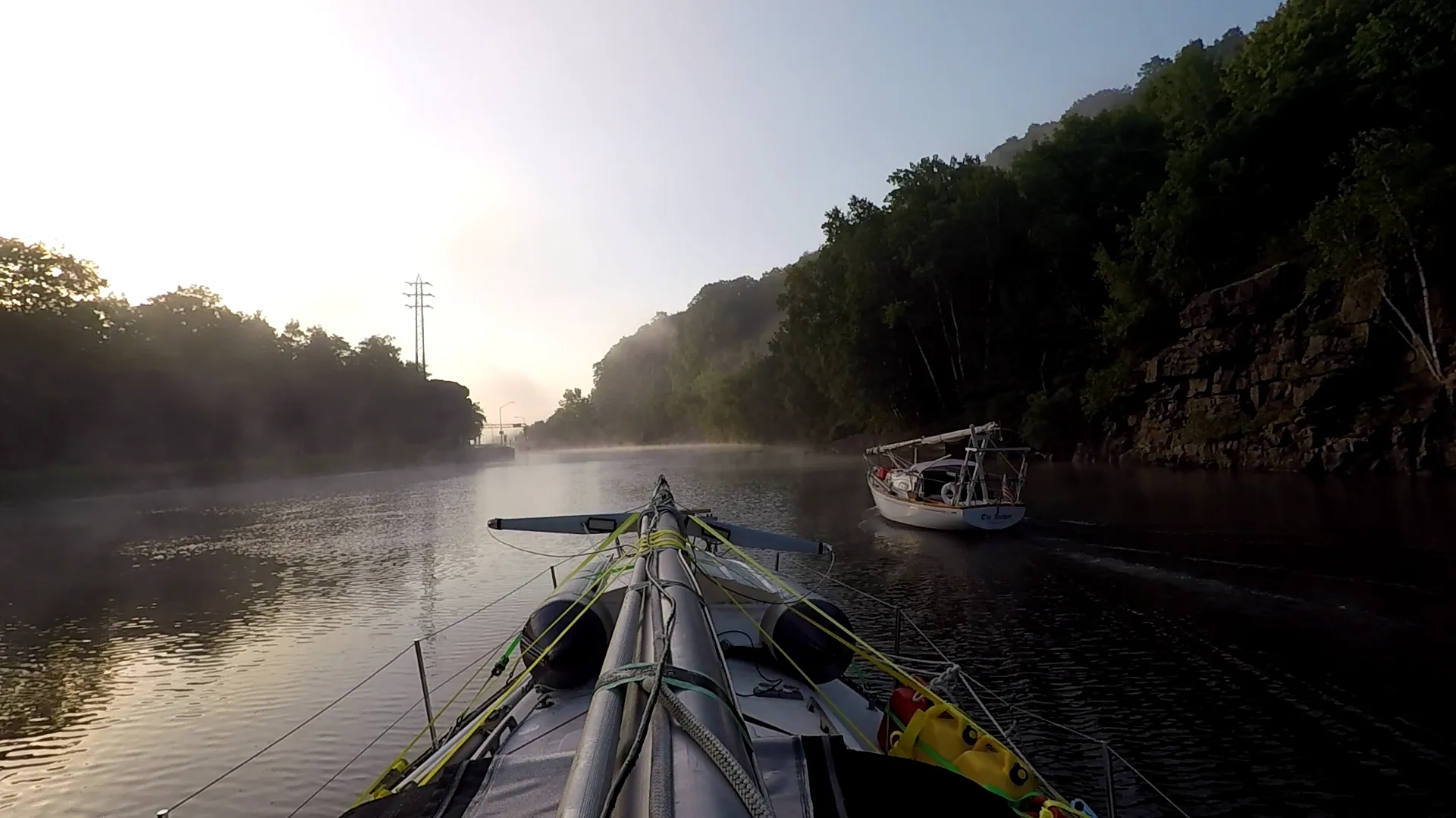 LadyK on the Erie Canal with a mast on deck to navigate under bridges.