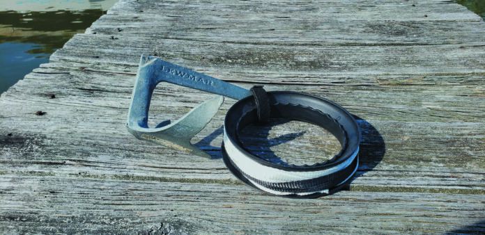 • Long anchor rode and anchor. A pivoting fluke-type will work, but a small version of an anchor you would use on your boat, such as a Mantus Dinghy Anchor or 4-pound Lewmar Claw are better. It needs to be able to catch the bottom. The first 50 feet of the rode should be a durable working diameter of at least 5/16-inch, but the next 100 feet or more can be polyester bull line or something else light. Keep it on a spool or well-coiled in a figure 8 or over-under coil, ready to go.