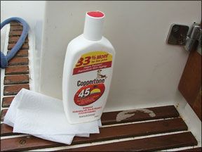 For some time, I noticed more and more bare spots on the cabin sole as well as the chart table, immediately after refinishing the latter with Cetol Lite. That had me puzzled, until one of the crew left the bottle of Coppertone on the regular Cetol covered companionway (see adjacent photo). I applied a dab of Coppertone to the same slat of teak a few inches away and was able to verify that, if left overnight, a brown, slimy goo forms. When wiped up with a paper towel, a bare spot results.