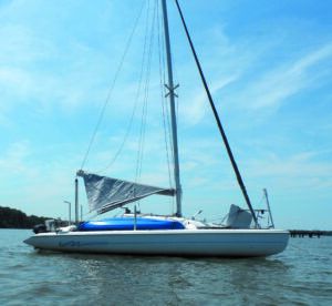 The down sides? The sheltered area is 20 percent less than a full awning, mostly with most of the lost area forward. It will likely interfere with a large dodger, especially when pulled down as a riding sail. Monohulls will require a spreader, but most awnings require that anyway. It will catch more side wind when moored between marina pilings. It does not shade the cabin top as effectively, so it won’t be quite as cool in dead air. It must be made of heavier cloth than the lightest awnings if you mean to use it as a riding sail. But there is only one spreader and you may not need a separate riding sail.