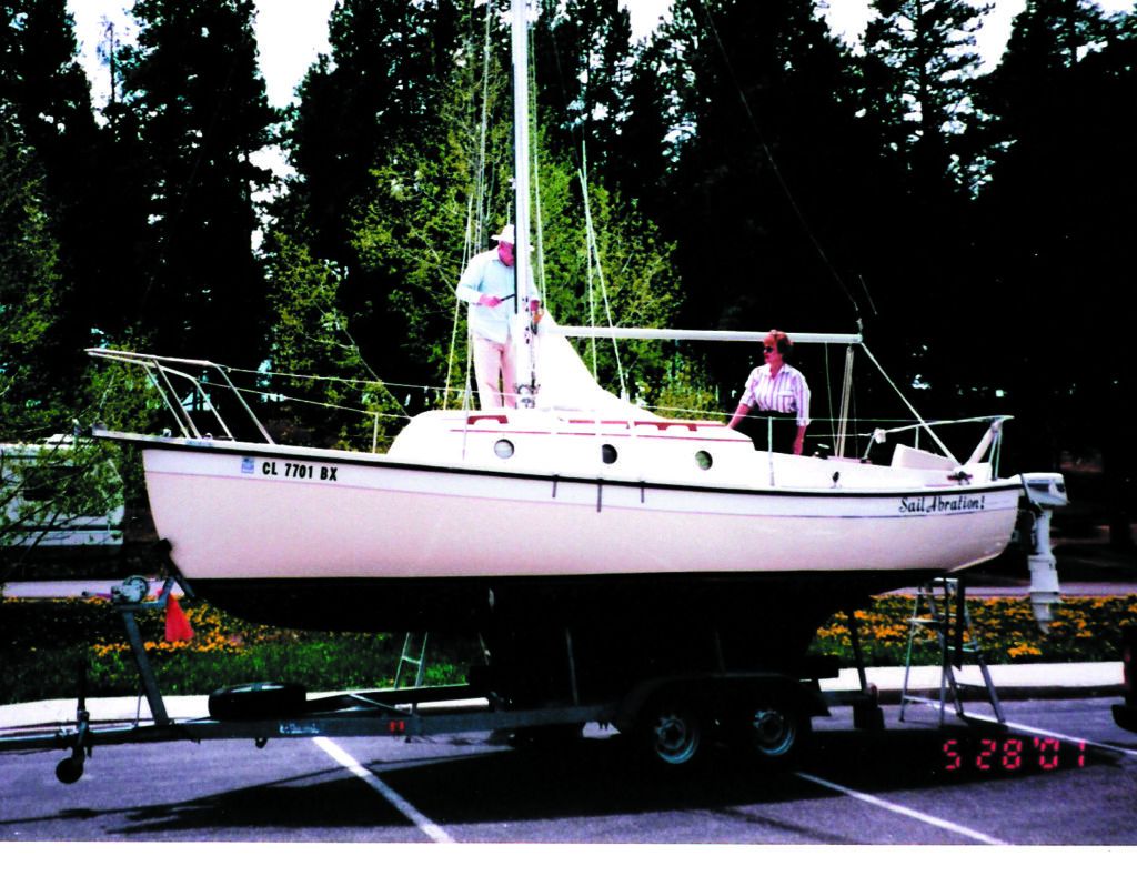 We then lightly sanded the epoxy and applied four coats of Micron with one white coat on the hull and three brown coats over it. We sailed out of Havre de Grace, MD for two more years getting as far south on the Chesapeake as the Solomons and as far north as the Delaware River. Then we moved west to Colorado and sailed for 28 years on Pueblo Reservoir and Lake Granby. When the boat was pulled each year, we took it to a car wash and hosed down the slime on the hull and in the spring applied a touch-up coat of bottom paint where we had brushed the bottom on groundings or rollers and bunks on the trailer had rubbed.