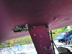 Our dealer applied KL990 for the bottom paint. When our boat was pulled in late September 1984, we had blisters even though the gelcoat was blister resistant. We washed off the hull and sanded down the blisters and left them to drain under a tarp for the winter. In the spring of 1985, we worked a deal with the marina yard to lift the boat at night with their Travelift so we could sand the hull and apply West System epoxy on the keel bottom and areas that the pads of the cradle covered in the daytime. Over several nights, we applied four coats of epoxy.