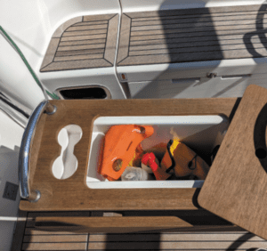 First, all control lines lead into the cockpit coach roof. Once they come through the clutches and winches they are stored in a bin under the floor just aft of the companionway. Second, there is a nice storage bin built into the table that holds all sorts of gear (see photos).