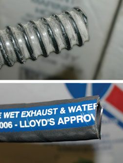 Alternatively, you could use a heavy walled, ultra-rugged SAE J2006 compliant hose-this meets the latest ABYC and National Marine Manufacturers standards for wet exhaust-such as Tridents Flex Marine wet exhaust hose. This hose is the ultimate in water conveyance for bilge and other below the waterline installations; however, its heavy, thick, and relatively stiff, which sometimes makes installation in close quarters challenging.