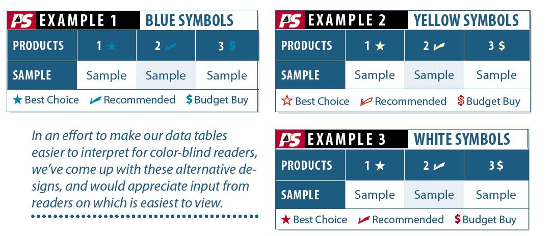 Wed appreciate it if any of you-especially those who have color blindness-would take a moment to check out the sample Value Guides pictured here, choose which you think offers the easiest-to-decipher ratings symbols, and email us with your answer ([email protected]) or comment on this article at www.practical-sailor.com. The top vote-getter will become our new standard in future issues.
