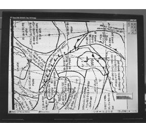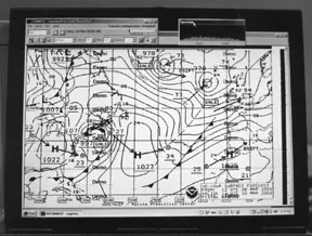 Weather charts were initially displayed in 8-bit gray scale. All the other programs display the charts in black and white. The 8-bit gray scale made the charts difficult to read because of the poor contrast. We tried using the menus to change the chart to a black and white style, but they became unreadable. We went to select the Undo function that’s listed in the manual, but we couldn’t find it in the program’s menu structure nor did the CTRL-U shortcut key work. Mark Freeberg of OCENS told us that to get the charts into black and white, we first had to select the histogram function and then press the greater-than sign (>). This undocumented command allowed us to change the background to white. According to Mark, this has been simplified in the latest version of the software and was available to download for free from their web site (version 2/2001).