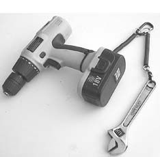 Part two of the Tool Leash is a “coil leash.” This is a 5-inch long coil with a swivel snap hook at one end and a wire ring at the other. You snap the hook onto the eye in the leash, and attach the ring at the other end to part three—an aluminum carabiner that can be used to anchor the Tool Leash to a belt loop, railing, rigging, or whatever. The coil leash is stretchy—it can extend from five inches to almost four feet—so that there’s a minimum of interference with the use of the tool. It’s strong, too. The manufacturer tells us that coil leashes have been tested to 30 pounds. Being of a suspicious nature, we took an 18-volt cordless electric drill, attached a tool tie to its handle, attached a coil leash, and dropped it. No problem. The coil leash not only withstood repeated drops, but returned to its original 5-inch length when we retrieved the drill.