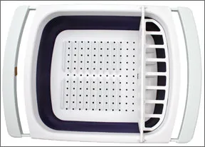 Collapsible silicone products: Silicone products are perfect for galley use as they collapse flat for compact storage and are easy to clean. The collapsible over-sink dish-drying rack ($25) takes up very little space when stowed (6 inches long, 12 inches wide, and 1 inches tall), but when its open, its large enough to handle most dishes, including plates up to 10 inches in diameter. The dish racks adjustable sides slide out to seat onto the sinks edges so that the dishes can be drying even underway. It holds eight plates and has a collapsible flatware tray for vertical drying.