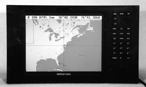 This plotter/sounder is unique among this group. It employs a cathode ray tube display (CRT), just like a small color TV. It consists of a basic plotter/sounder, with a separate cartography unit grafted on to the base of the CRT. The cartography unit enables the use of Navionics minicards. Our unit had the optional internal GPS (DGPS also is available). Addition of the cartography unit makes for an electronically seamless package.