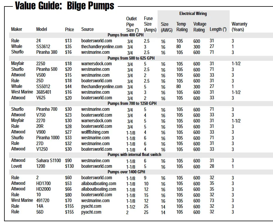 In the small pump group, rated at less then 400 GPH, we selected the Shurflo Piranha 380. In the 500 to 625 GPH range, the Rule 25D was our top choice. In the 700 to 1250 GPH range, the Shurflo Piranha 1000 was top dog. And in the over-1400 GPH pumps, we selected the West Marine 491720.