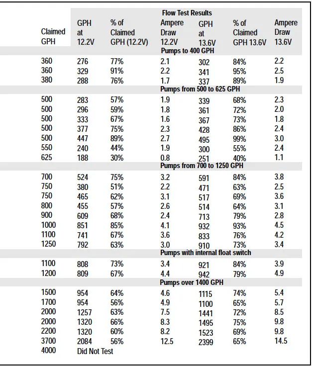 The best-performing pumps in this bunch were the Whale and the Rule; both pumped at 75% of their marketed GPH or more on all tests. The Whale actually bested all others by hitting 99% of its rated GPH at 13.6 volts.