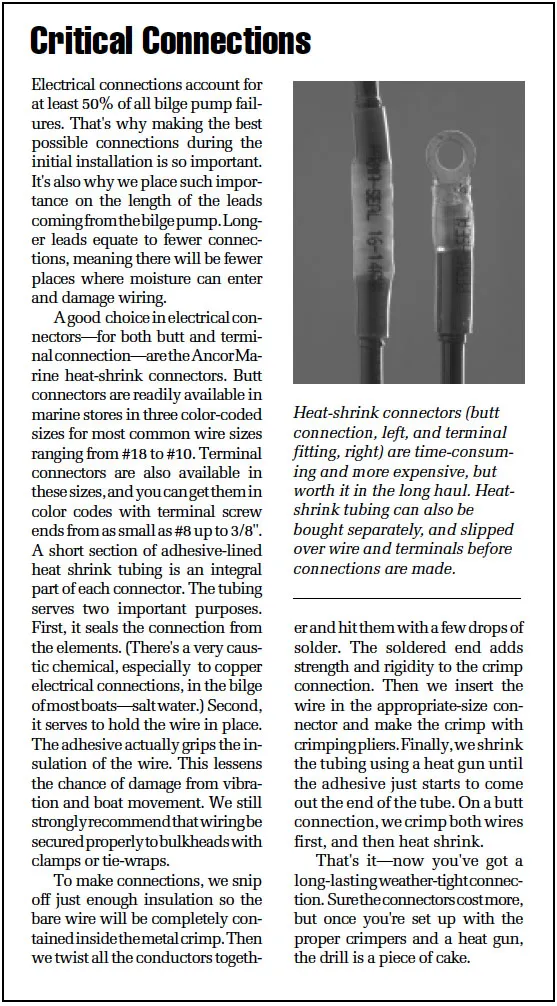 Wiring on each pump was rated in five areas. First, whether or not the wire is constructed of tinned copper, as is the consensus recommendation of marine electrical experts. We also stated the wire size, insulation temperature rating, insulation voltage rating, and—of most concern to an installer—the length of the leads. In our opinion, the leads simply can’t be too long. It’s best not to have any connections between the pump and the bus bar powering the pump. This lessens the chance that corrosion will attack the pump wiring. If the leads are too short to reach the bus bar you’ll be forced to add more wire with a butt connection or junction box, either of which gives corrosion another avenue into your wiring.