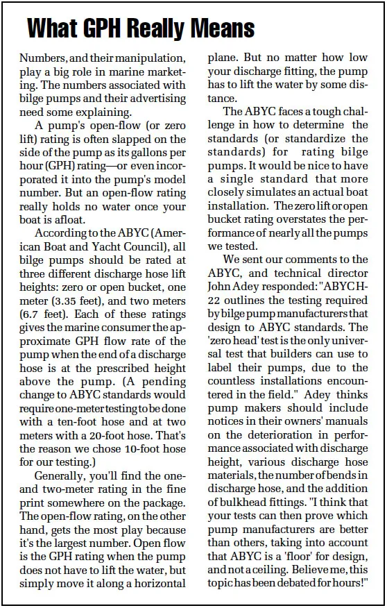 ABYC (American Boat and Yacht Council) standards—currently being revised—say a bilge pump should be able to dry run at design voltage, that’s 13.6 volts for a 12-volt pump, for at least seven hours without failure. We added a test to confirm compliance with this standard. In the final analysis, we picked the top-rated pump in each group based on performance, warranty, wiring and price.