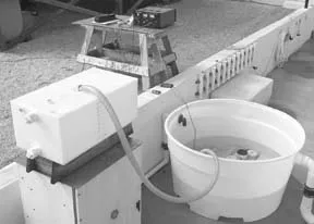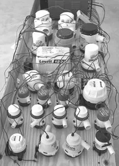 Testers used two plastic tanks, one as a supply tank and the other as a receiver tank. The supply tank was a 200-gallon bait tank. We used a swimming pool pump to fill up the tank with water from the adjacent canal. Prior to each pump test, about 60 gallons of water was put into the supply tank. Each pump was attached to the same half-inch thick piece of plastic using its provided mountings. The plastic was then placed at the bottom of the supply tank and held in position with heavily weighted containers. For discharge hose, we used appropriately sized Unaflex Series 162 nylon reinforced plastic connected to the pump with a single clamp. It’s smooth bore PVC tubing and is recommended for use as bilge pump discharge hose. All hoses were 10 feet long. At the other end of the hose we single clamped a plastic bulkhead fitting, typical of one you’d find installed aboard most boats. This end of the hose was placed into the top of our receiver tank, a 22-gallon plastic tank marked in two-gallon increments. The receiver tank was located five feet above the level of the pump. Electricity was supplied to each pump from our power supply through 20 feet of #14 wire to the fuse panel and then on to the pump.