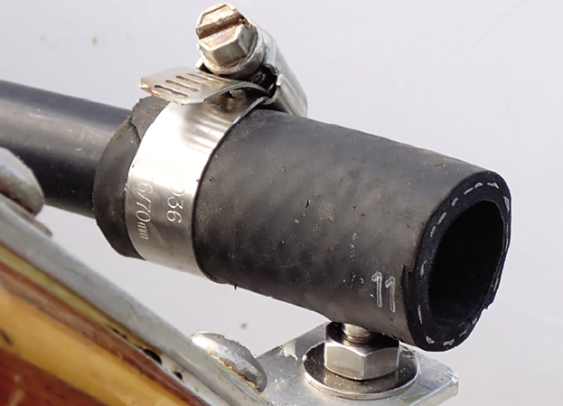 Available in 1- to 6-inch lengths, push-rod extensions help with wide cockpits. They can be combined with the 0.8-inch rubber hose extension used to center the tiller on a modified installation (Photo 4). Push-rod extensions are handy if retrofitting a Simrad pilot in Raymarine mounts. We have seen push-rod extensions up to 12 inches made from aluminum tubing, slipped over the original push-rod and bonded in place with epoxy. As long as the tubing is stiff, well-fitted, and properly aligned, they work fine. A 12-inch extension is probably the practical limit.