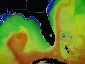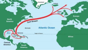 The realm of the Gulf Stream spans the Caribbean Sea, the Gulf of Mexico, and the North Atlantic Ocean starting along the shorelines of the Gulf States, stretching north along the US eastern Seaboard and Atlantic Canada before heading for Europe. The NOAA National Ocean Service rates the average speed of the Gulf Stream at 6.4 Km/h or 4 mph – fastest nearer the surface. Water temperature ranges from 7- to 22-degrees Celsius, a peak temperature not too far off the prerequisite minimum ocean temperature of 26 degrees Celsius when it’s hurricane feeding time.