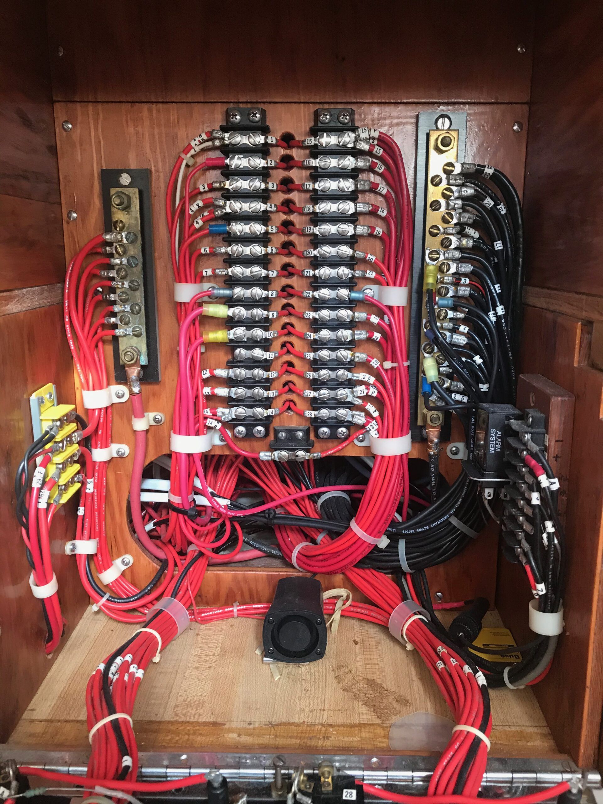 Your goal, in such an audit, should be to examine every individual circuit, end to end. If you have sections of cable run that are completely inaccessible—maybe through a cabinet before the original boat manufacturer glassed in an additional section—this might be difficult to achieve. That leaves you with two options e.g. either: replace the circuit, routing it somewhere that can be traced—which is what I did—or; create some suitably large inspection hatches to examine the wiring in situ. In an older boat you may also find that multiple cables are bundled together with insulating tape and, if you do, you have to unwrap and clean up the whole sticky mess, just to see what you have hiding underneath.