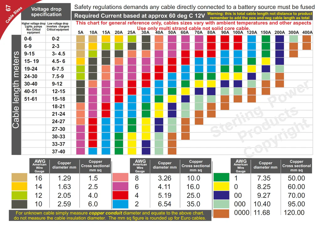 So, the primary conclusion from this is that you need to pay close attention to the size of your charging cables. You are probably all familiar with the West Marine cable sizing charts but the best I have come across is the one reproduced here (with the kind permission of Sterling Power). The first thing to note is that they place charging cables in the 3 percent category, rather than the traditional 10 percent category, where they have historically been placed, being viewed as a “non-critical” load.