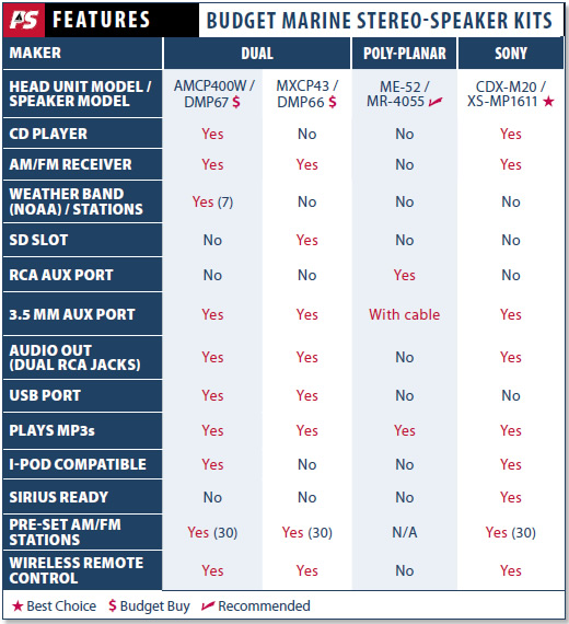 Practical Sailor evaluated four budget-friendly marine audio packages. Two are made by Dual Electronics Corp.: the Dual AMCP400W and MXCP43. Dual, established in 2003 as a subsidiary of Korea-based Namsung Corp., is one of the largest suppliers of marine stereo and speaker units. We also tested the ME-52 from Poly-Planar, a Maryland-based manufacturer specializing in marine audio systems, and the CDX-M20 from electronics giant Sony Corp.