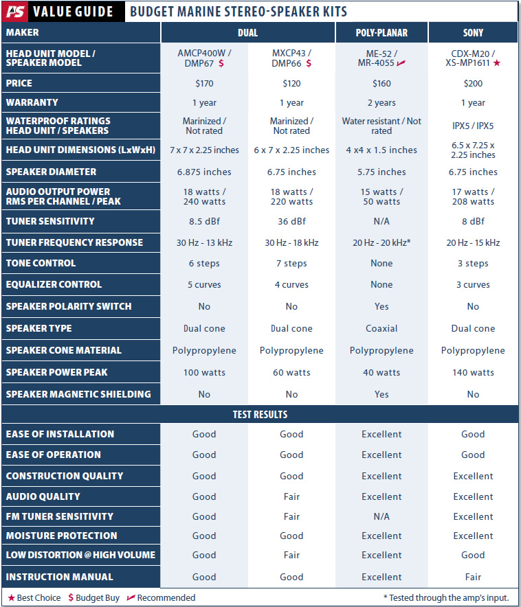 Practical Sailor can recommend all four of the tested packages, but the Sony CDX-M20 package gets the Best Choice pick for its top-notch construction quality, intuitive controls and programming, multiple features, and comparatively excellent sound quality.