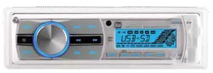 The Sony’s CD-player opening has a rubber splash-proof gasket for protection and its auxiliary input comes with an untethered silicone plug. The Sony does not offer weather band, but it plays MP3 files, is iPod compatible, and has an AM/FM receiver with 30 selectable pre-set stations. The RDS-compatible display means that it will show the now-playing artist and song on select FM stations. The Sony was the only satellite-capable test unit; it will connect to Sirius XM radio.