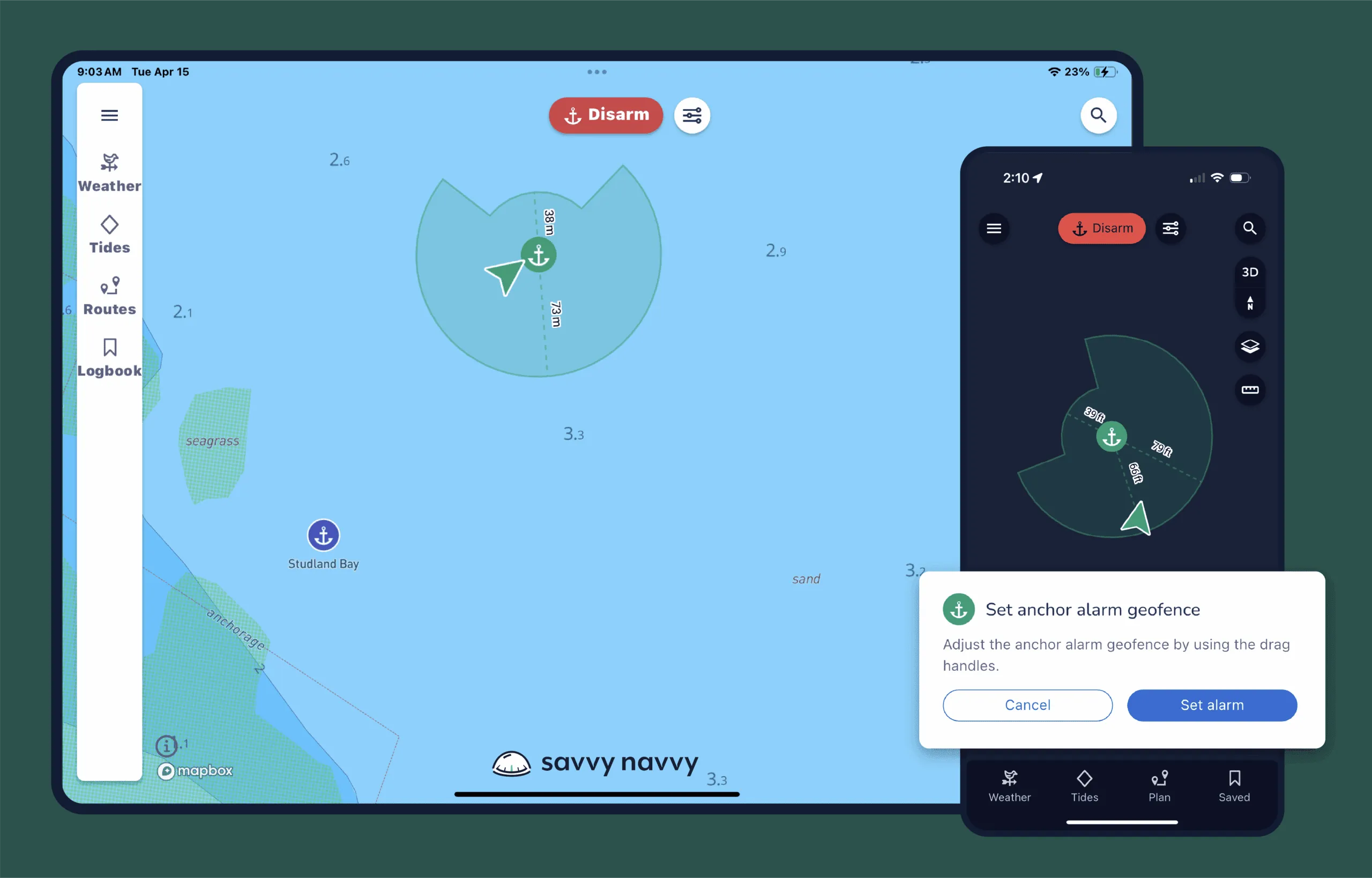 The Anchor Alarm is a great and simple feature to use. Making sure your Location is turned on your device(s), you set the anchor rode length you have out and at what distance do you want the alarm to sound. Once the boat goes outside that zone, a very distinct alarm will sound off, akin to a submarine diving alarm. It will also send out an email to warm you the boat is out of the safety area. You do have to leave one device onboard as a beacon. So, getting an email is very practical.