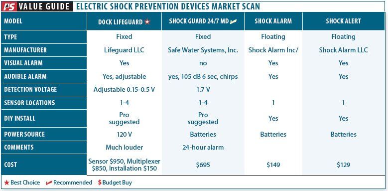 Safe Water Systems Shock Guard 24/7 Up to four sensors, each protecting a 26-foot radius. Detects as little as 1.7 volts differential from ground. Powered by a 9 volt battery, the alarm, which is not very loud, emits six second chirps for 24 hours, after which the battery is dead. Annual replacement is required. The battery can be tested by placing a supplied magnet against the panel is a specific location, which lights a light and causes a chirp. Panel includes 105 dB buzzer and contacts to trip up to four GFI circuits, $695 (www.safewatersystemsinc.com).