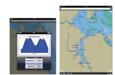 With its 6-inch by 8-inch screen (9.7 inch diagonal), the iPad has as big a viewing area as many stand-alone chartplotters. With suitable apps, the iPad works much the same as all available chartplotters, with the normal functions people have come to expect—current position, speed and course over ground, waypoints and routes, tracks, anchor alarm, and so on. Many of the navigation apps have add-ons such as weather overlays, displays of heading and speed, tide and port information, ability to e-mail your current position, satellite overlays, and so on.