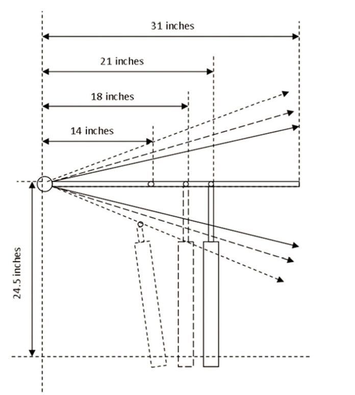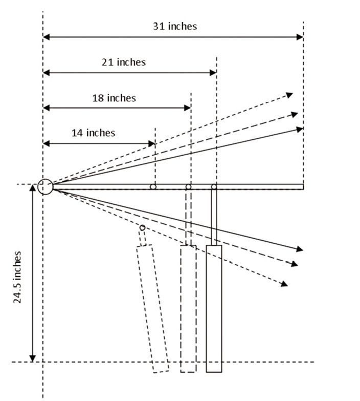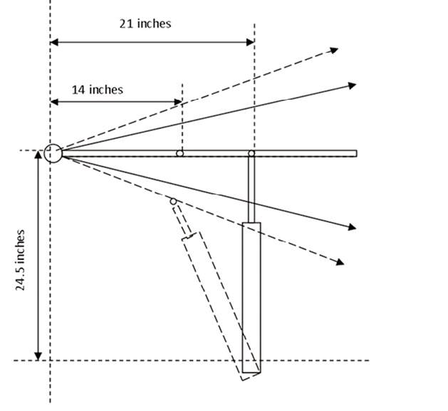 Image 1. The socket is located 24.5 inches to the side of the centered tiller, just like the instructions say. The pin is located at 14 inches, 18 inches (factory recommendation), and 21 inches forward of the rudder stock, and the socket is located at matching distances, maintaining a 90-degree angle to the tiller when centered. In each position, the maximum port and starboard rudder angles are identical. The push-rod delivers maximum force, and the total helm angle ranges from 26 degrees to 42 degrees.