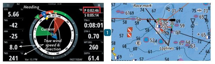 These image pairs (labeled 1 & 2) are from a B&G Zeus 3 MFD with input from the Furuno SCX20 compass. Each pair represents nearly the same moment in a race in different views.