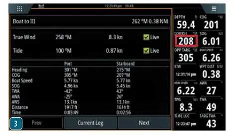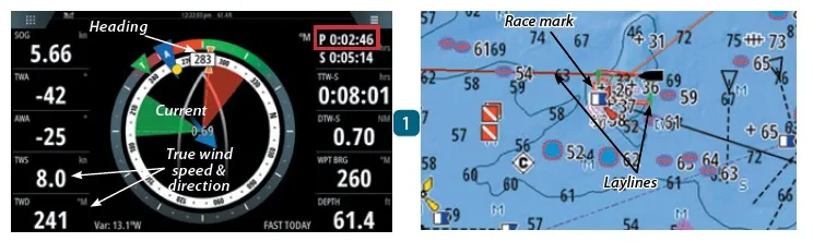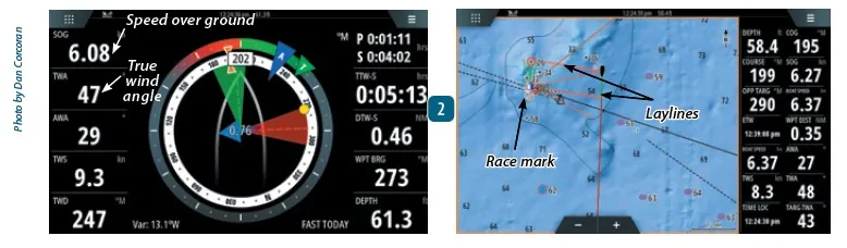 If you are willing to clean and calibrate your boat’s speed through water (STW) paddlewheel and compass very accurately, many MFDs manufactured within the last ten years offer features to graphically show with arrows the effect of the wind and water on your boat. Some provide additional features, such as drawing on the display a line for the upwind course your boat could achieve in current conditions if you were to tack or jibe at the present moment. Some MFDs, like the B&G Zeus 3, can even guide you to the start line of a race better and predict at what angle the wind will be off your bow on each leg of a racecourse, helpful in deciding in advance how you will set your sails.