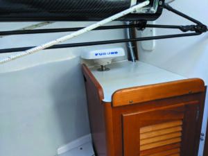 3. If your boat isn’t constructed of carbon fiber, metal, or other materials that entirely block GPS signals, you can consider installing the antenna inside your boat. On Strider, the Furuno SCX20 was installed in the V-berth using the rail mount option. The single NMEA-2000 cable runs through the mount.