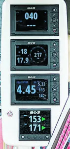 Strider has two other compasses, including a Maretron solid-state compass dedicated to the autopilot and an inexpensive solid-state compass— similar to the compass in your smartphone— built into her main GPS, a B&G ZG100.