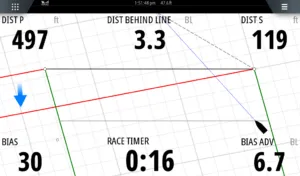 1. In this screen grab, the sailor is pacing to arrive at the start line in 16 seconds. The boat’s sensors aid the MFD in accurately portraying a tidal current (blue arrow), and to help determine that the right side of the line is favored by 6.7-boat-lengths (blue box, lower right). Mark Chisnell details the other features shown in this image (see www.bandg.com/blog/racepanel-series-with-mark-chisnell-part-5-sailsteer/).
