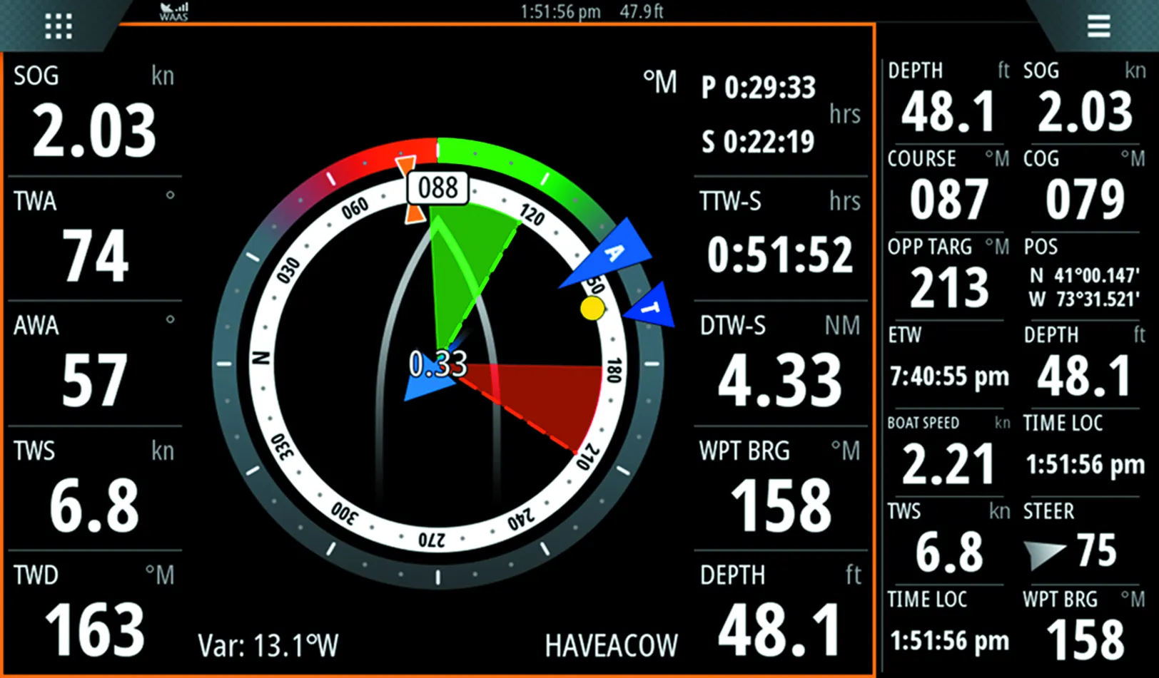 For example, if your STW is off by ½ knot, it could go harmlessly unnoticed on an instrument display showing boat speed in one dimension, but allow the MFD to calculate the direction of the water under your boat in two dimensions, and it could very well appear that water is improbably coming from a landmass and your lay lines could be off by as much, or more, than 45 degrees.