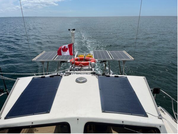It may seem obvious that the size of your sailboat has a major impact on the design and complexity of any solar power system, but sailboat size is not the only factor to consider, especially when determining what your overall budget might support. Does your sailboat have a dodger, bimini or dinghy davit system? These accessories can considerably aid solar panel installation. Does your sailboat have an AC power system? Does your sailboat design include bulkheads or a floor grid that provide space for cables or hoses to run through freely? Is your sailboat a sloop monohull with center cockpit, a ketch, or is it a catamaran or trimaran? These designs all present opportunities and challenges for solar panel installation, which includes figuring out how to position the panels to maximize sun exposure and minimize shade. The most effective location for solar panels is on a stern dinghy davit arch mounting system. A location that has the least amount of shading from sails, mast, boom and other components is the most effective.
