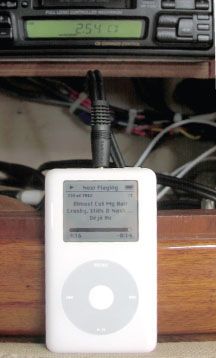 We installed the iPod so that it played through the boat’s stereo system. We have an old automotive Sony cassette/radio unit that also connects to the CD changer. Through some simple wiring changes using Radio Shack audio cables we could play either the iPod or the CD player through the boat’s speakers using the Sony stereo. We had previously tried an FM transmitter from the iPod, but we couldn’t stand the tinny sound. We also installed a 12 volt cigarette lighter socket nearby to keep the iPod charged.