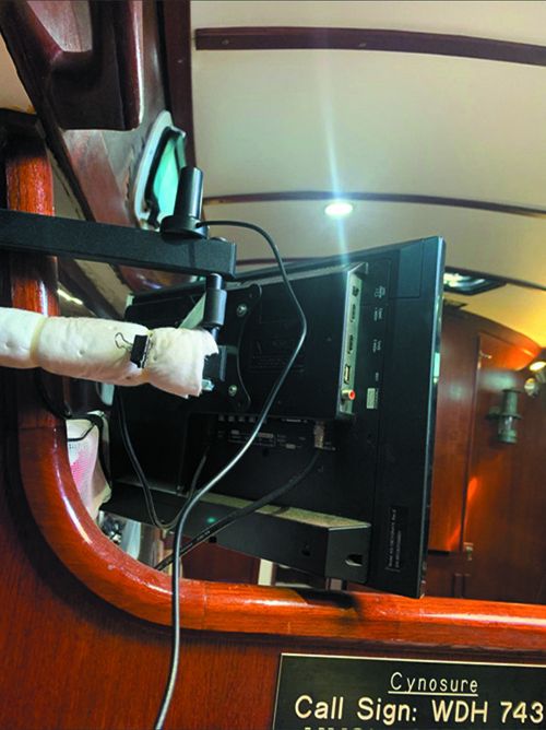 2. The photograph below shows the optional GO small antenna mounted on the TV arm of my boat. While it is possible to receive GRIB files with the antenna located below decks on the author’s Tartan 33, connecting with satellites can be vexing.