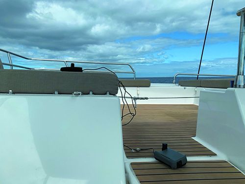 Iridium says that the device needs an unobstructed view of the horizon. In the past, I had installed my Garmin inReach at the navigation station of the boat being delivered. For 95 percent of the boats I have moved, this worked. On a catamaran, placing the inReach in the front window also worked well. Reception with the Iridium GO was more challenging.
