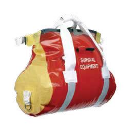 The Survival Equipment bag comes in two sizes, the 1,800 cubic-inch/30-liter model ($140) we inspected and a larger 2,800 cubic-inch/46-liter version ($160). Both bags are constructed of high-visibility, bright red and yellow, polyurethane-coated nylon and feature overlapping, radio frequency (RF)-welded seams. Other construction details include Mil-spec stitching; dual, two-inch-wide strips of SOLAS reflective tape; two stainless-steel D-rings; compression straps; and a Mil-spec, screw-top oral inflation valve that allows users to inflate the bag after its sealed. The duffel straps are extra long, which makes it easy to slip your arms through them and hold the bag to your chest when added personal flotation is needed.
