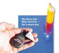 We just had to test this. Davis claims the float can support 4.2 ounces for at least 40 minutes, so testers attached a 4-ounce lead sinker to the keychain and tossed it overboard. As advertised, the unit rose to the surface in 24 seconds and was easily seen and recovered. The Key Buoy is a one-shot deal, so its not the most economical way to keep track of your keys, but it is small (1.1 ounce and is the size of a standard car alarm key fob).