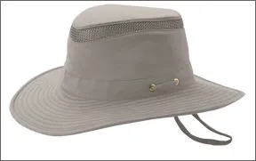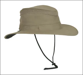 We tested three of the over 100 hats on the Tilley website; two are nylon and one cotton. All three vented hats have a firm, wide brim with rows of stitching to help them keep their shape; a padded crown with hidden pocket; and a soft interior sweatband. Sliding the Tilley wind-chord knots tightens the chin straps and crown adjustment bands.